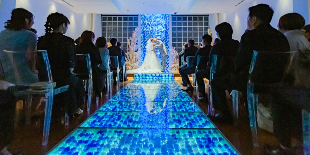 バージンロードが他にはないデザインでとても可愛いく、椅子も透明で会場に合っていてすごく可愛くて最初に見た時からとても気に入りました。シャッターが開いて自然光を入れることもできてとてもいいです。落ち着いていて、大人っぽい雰囲気が良かったです。